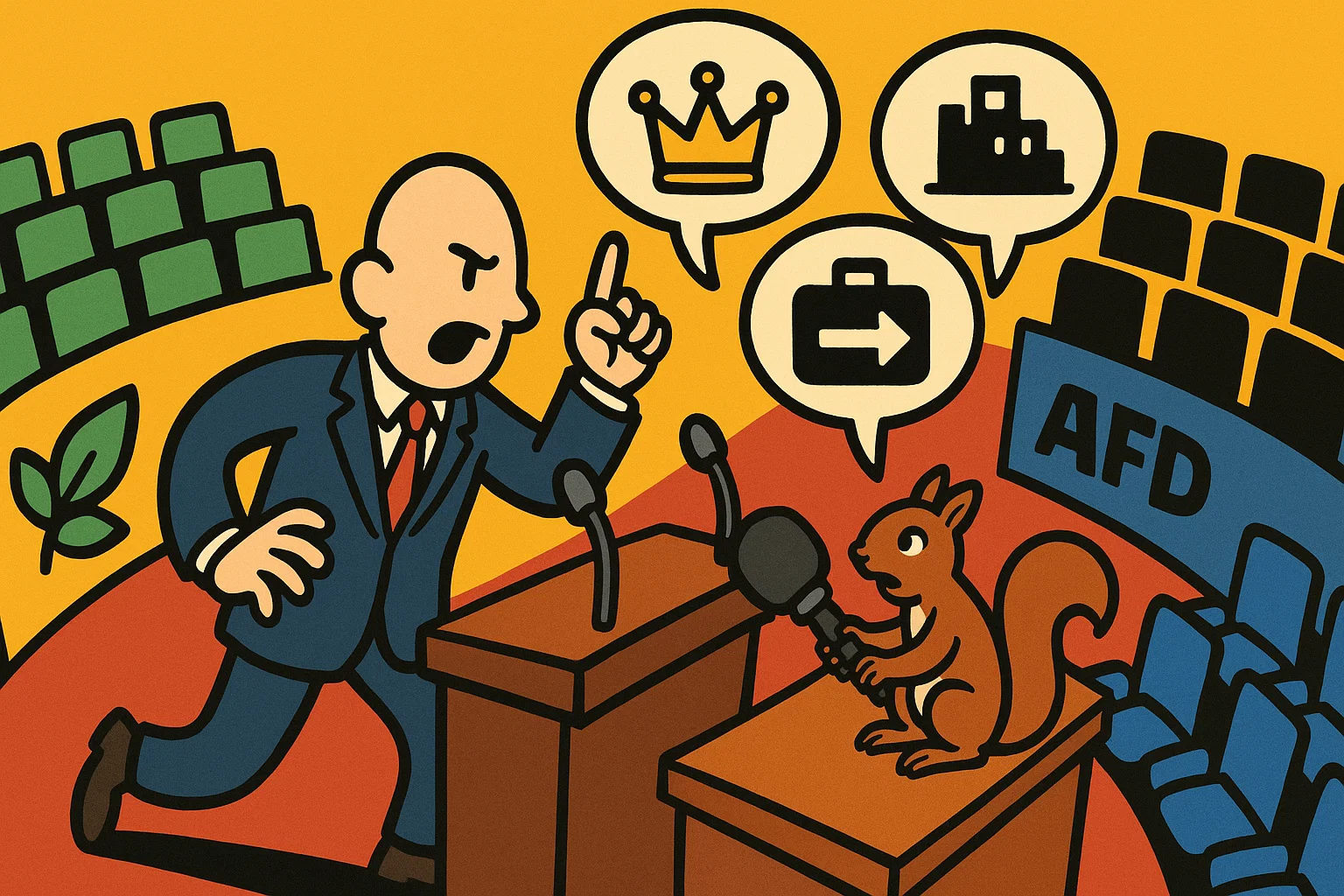 Satirische Illustration: Bundestagsplenum als abstrahierter Halbkreis. Im Zentrum eine Cartoon-Figur am Rednerpult mit erhobener Hand. Zwischen den Fraktionsblöcken von CDU (schwarz) und AfD (blau) schweben symbolische Sprechblasen mit Piktogrammen: Krönchen („Paschas"), Stadtsilhouette („Stadtbild"), Koffer über Pfeil („Asyltourismus"). Ein Eichhörnchen sitzt auf dem Rednerpult und hält ein übergroßes Mikrofon.