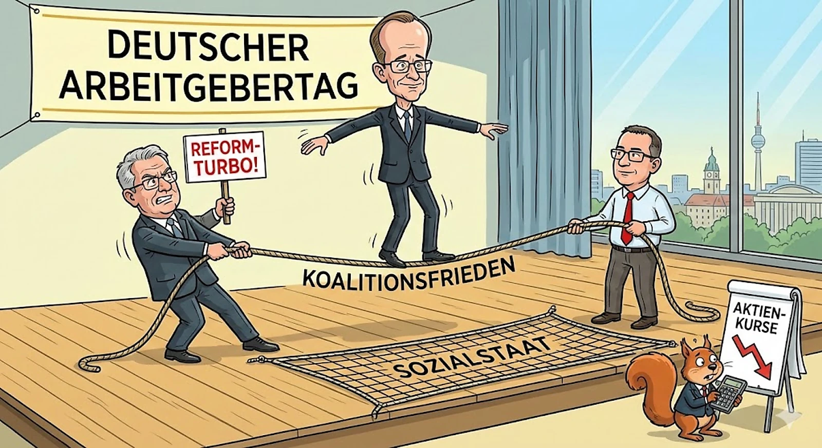Karikatur: Merz auf dem Drahtseil zwischen Wirtschaft und SPD